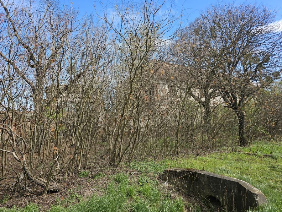 Az épületek mögötti romantikus, gazos, itt-ott szemétlerakós részen találtuk meg az egykori sajtgyár kéményes épületét. Nem véletlen a falon a cirill betű: igen, ez volt a híres szovjet mosoda, a szombathelyi alakulatok szennyese ázott itt a sajtkádakban egészen a kivonulásukig.